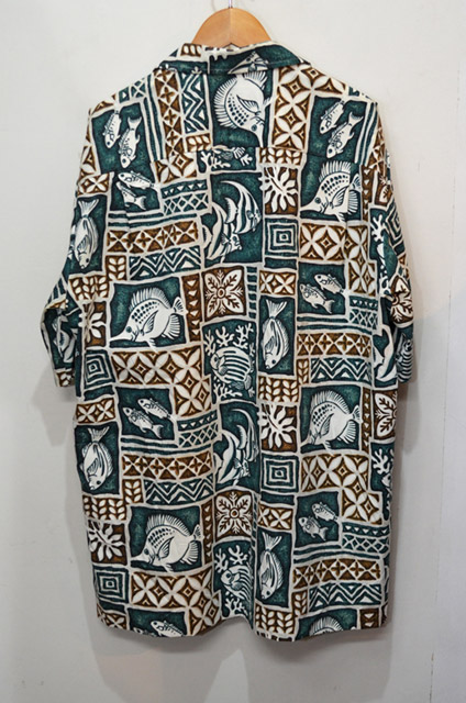 1990年代製、ロイヤルクリエーションズというブランドのハワイアンシャツです。素材はコットンポリエステル混紡のややサラッとした質感のグリーンベースボディに魚などが全面に描かれた一枚です。サイズ表記はLで、ややゆっためで着用するには最適なサイズバランスです。更に今回は未使用のデッドストック品とこの上ない状態でのご紹介です。今期も注目のハワイアンシャツですので、お探しの方はこの機会に是非ご検討ください。