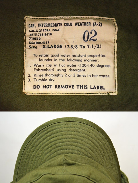 1960年代製、アメリカ海軍に官給されていたA-2シリーズのキャップです。A-2と言えばデッキジャケットが真っ先に思い浮かびますが、こちらはそれと同じ生地を使用した稀少なキャップ。80年代頃まで少しずつ仕様を変更しながらひっそりと造り続けられていた珍品ですが、こちらは非常に稀少な64年-67年頃に製造された個体。しかも小さなサイズが殆どな中サイズ表記がX-LARGEという実際に着用可能なサイズで、更に状態がデッドストックというこの上ない条件です。ジャケットで言う三角フラップの付く初期型と同時期に製造された逸品ですので、是非この機会にご検討ください。