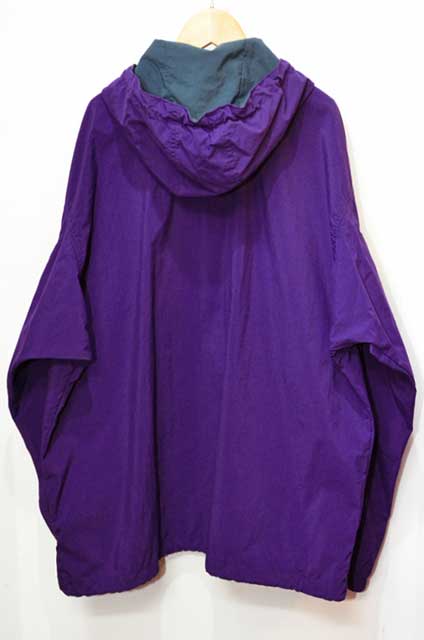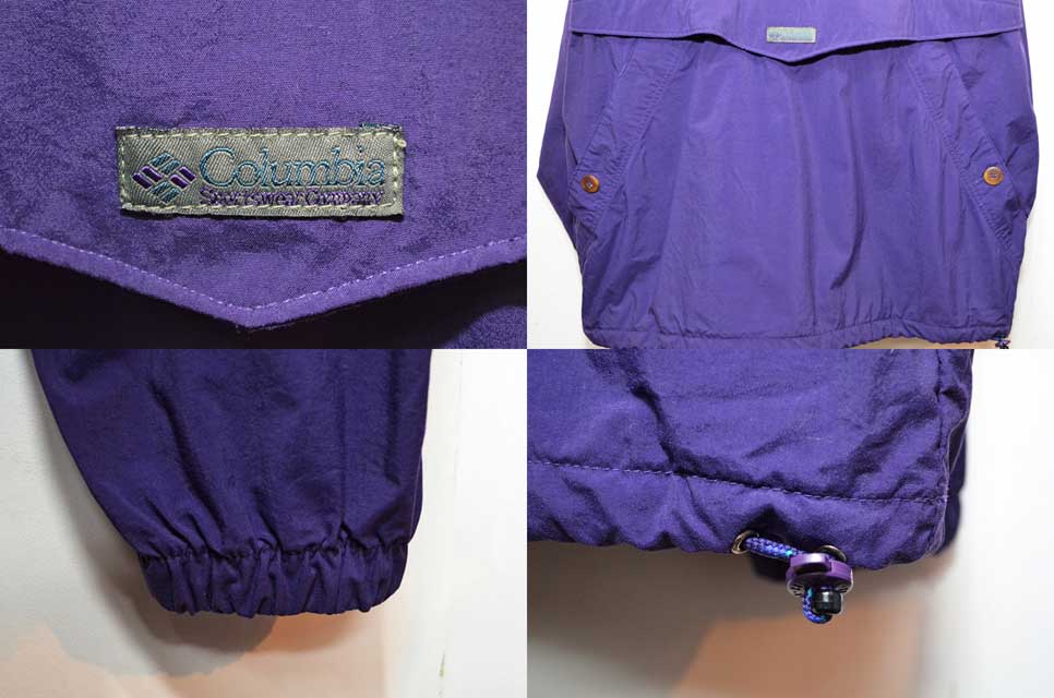 Patagonia等のメジャーなアウトドアブランドと比べ知名度では劣るものの、エッジの効いたプロダクトを多く輩出し近年再評価する声が高まっている『コロンビア』のナイロンアノラックパーカーです。製造は1990年代で、お色はパープル×グリーン。首元がジップではなく掛けボタン仕様という捻りの効いたディテールが目を引く当時のコロンビアを代表するデザインのアイテムと言えるおすすめのアイテムです。配色やサイズに拘って探すと中々条件に合う物は見つかりませんので、是非この機会にご検討ください