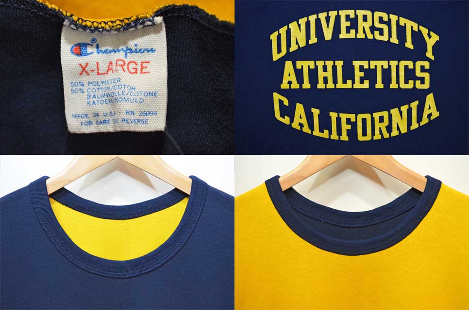 1980年代製、チャンピオンのTシャツです。A面がネイビー・B面がイエロー×ネイビーの首リブといういわゆるダブルフェイス仕立てのヘビーな仕様の一枚で、裾にはプリントのトリコタグ付き。A面には『UNIVERSITY ATHLETICS CALIFORNIA』の3段プリント入りで、縮みや型崩れ等のない状態ですので今後も長くお使いいただけるのではないでしょうか。王道のアメカジスタイルには欠かすことの出来ないアイテムですので、是非この機会にご検討ください。