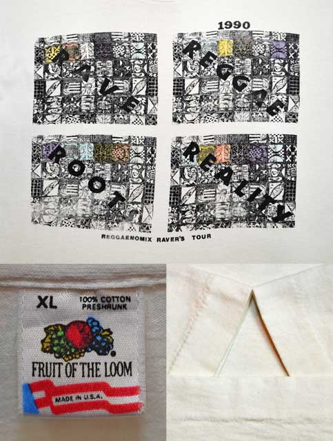 1990年代製、『REGGAENOMIX RAVER'S TOUR』のTシャツです。1984年にブルックリンのニューウェーブレゲエバンドの『MONYAKA(モンヤカ)』が『REGGAENOMIX(レゲエのミクス)』というタイトルでLPをリリースしており、その関連かと思いますがはっきりとした詳細は不明です。ボディはUSA製のフルーツオブザルーム、音物らしいグラフィックや意味深なカラーリング、手刷りっぽいプリントと良好な雰囲気を漂わす一点です。是非この機会にご検討ください。