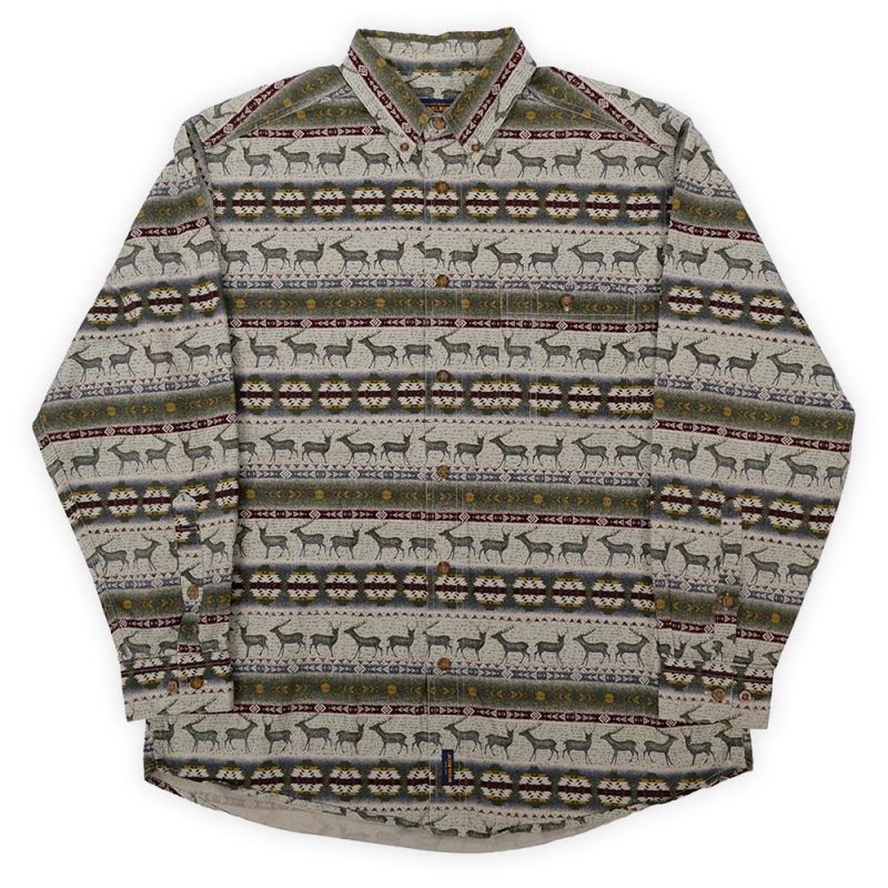 老舗アウトドアブランド『ウールリッチ』のBDシャツです。こちらは1990年代末頃に製造されたオールド物で、ネイティブ柄に鹿等を組み合わせたボーダー調の総柄が目を引く一枚。ポケットの柄合わせなど細部まで造り込まれた良品ですので、是非この機会にご検討ください。●表記サイズ