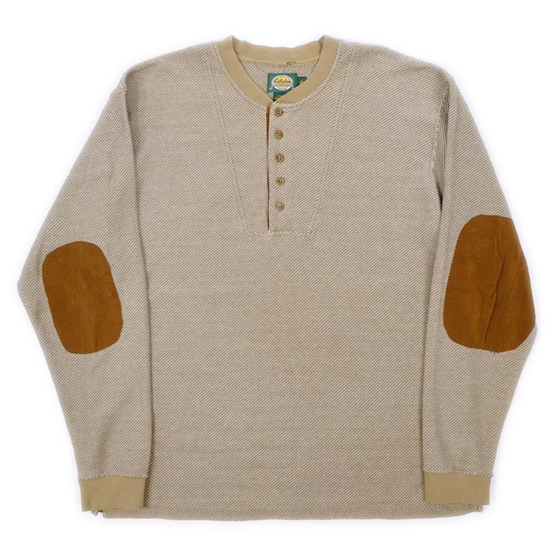 ヘンリーネック仕様で裾リブの付かないカットソータイプのこちらは、使い勝手の良いグッドレギュラー。左右で若干サイズが異なるスウェードのエルボーパッチもアメリカ古着らしい味と言えるおすすめの一着ですので、是非この機会にご検討ください。●表記サイズ