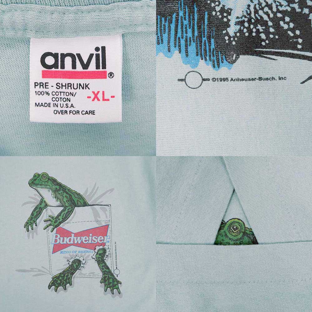 ビールメーカーの中でもお探しの方の多いバドワイザー物ですが、こちらはあまり見掛けないデザインの両面プリントが目を引く一枚。ボディはUSA製のAnvilで、袖・裾ともにシングルステッチ縫製という点も嬉しいポイント。おすすめですので、是非この機会にご検討ください。●表記サイズ