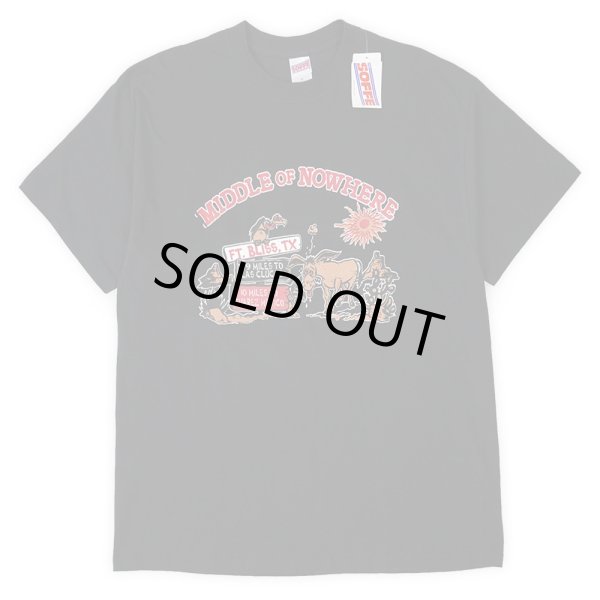 ニューメキシコ州とテキサス州を跨ぐ形で展開される米国陸軍の駐屯地『フォート・ブリス』のお土産用という、なんともマニアックで二ッチな一枚。ボディは米軍御用達のソフィー製で、『MIDDLE OF NOWHERE(ド田舎)』の自虐的なアーチロゴとファニーなイラストが目を引く、雰囲気抜群のアイテムです。