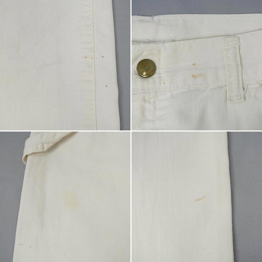 ペインターパンツと言えばデニム地の物が多い印象ですが、こちらは生成りのコットンファブリックで仕立てられた一本。薄汚れは否めませんがいずれも致命的なものではなく、それほど汚らしい印象を抱かせない状態ですので是非この機会にご検討ください。
