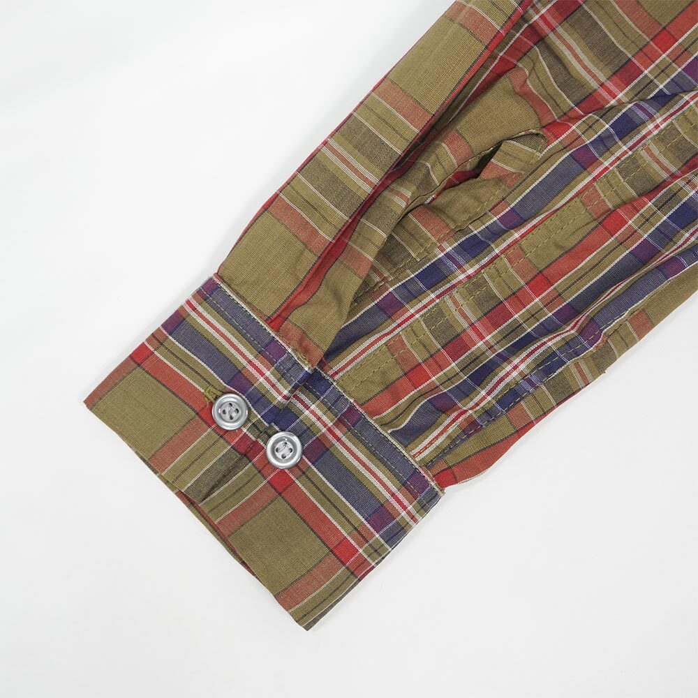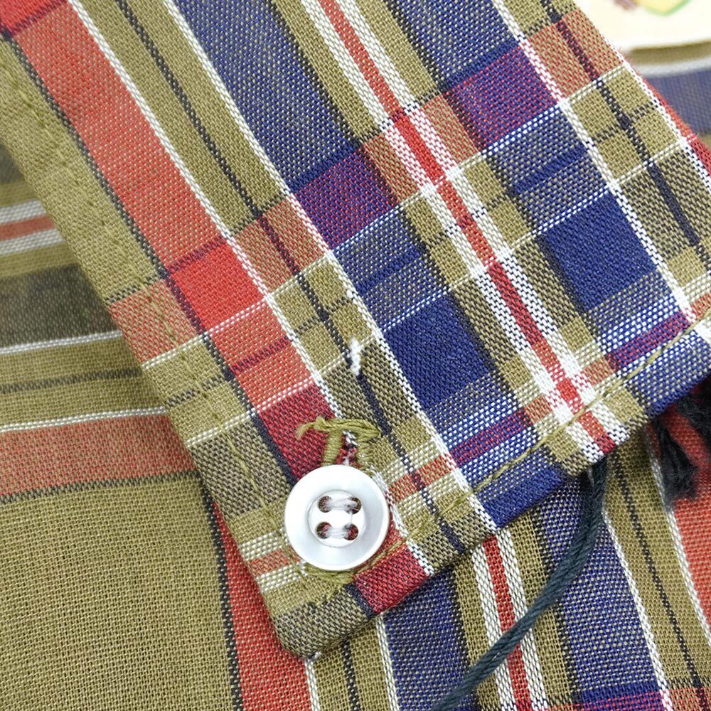 一見オーセンティックなBDですが、ループ留めのトップボタンを開けるとオープンカラーにもなる古い年代特有の2WAY仕様の襟が特徴の一枚。オリーブを稀少に構成されたチェック柄も雰囲気抜群で、さらに状態はフラッシャーが残るデッドストックと文句の付けようがない個体です。
