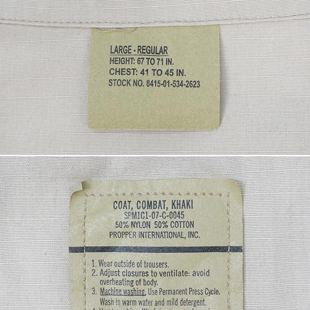 タグに記載された『COAT,COMBAT KHAKI』の文言通り、カーキ色のリップストップ地で仕立てられたBDUタイプのジャケットです。2007年にアメリカ軍に官給された物で、コントラクターはストリートで熱い支持を受けるPROPPER(プロッパー)。