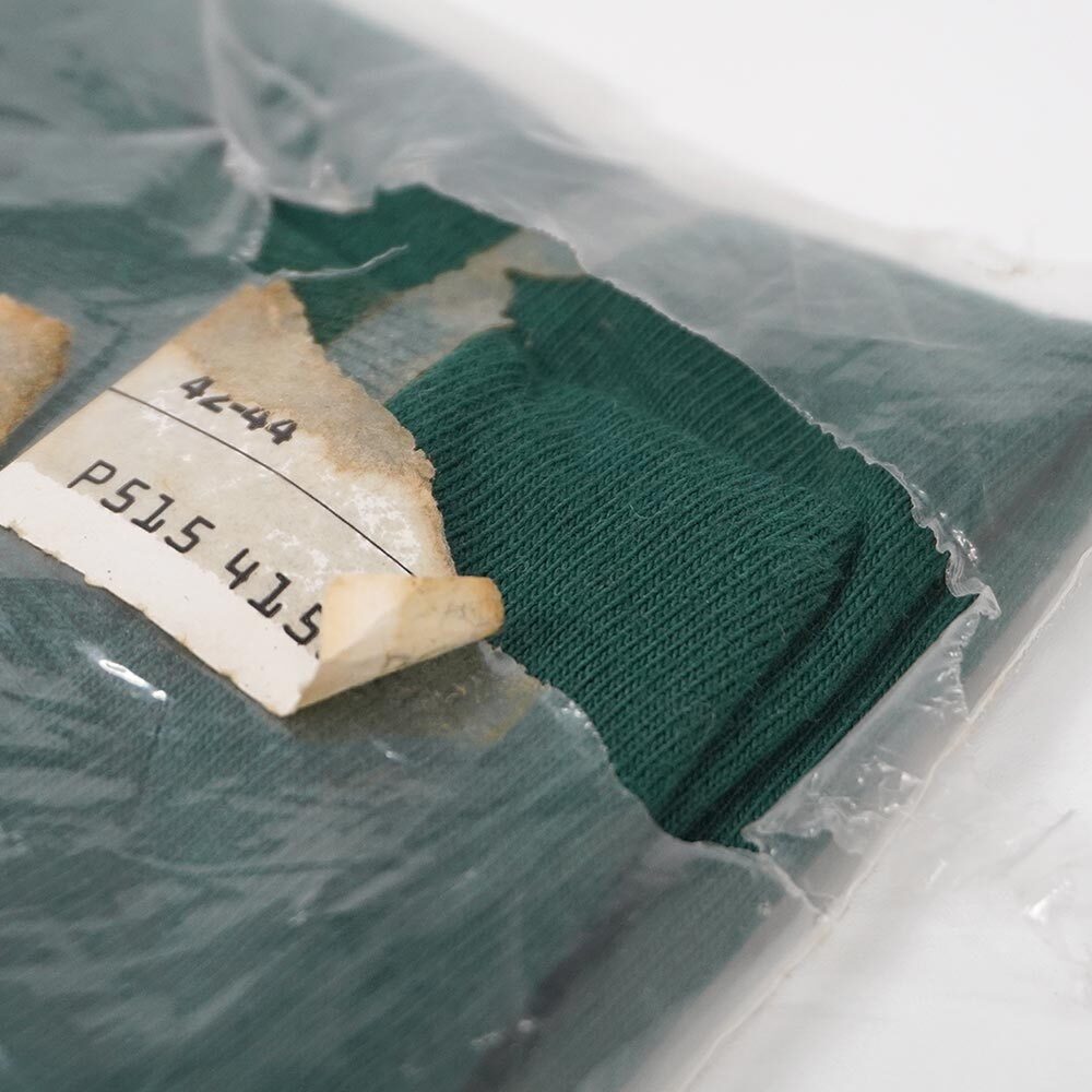 何枚あっても困ることがない無地のポケTですが、こちらは今から約50年前に製造された物の稀少な未開封品。お色はUSEDでもあまり見掛けない青みが強いグリーンで、化繊が混じらないコットン100%素材も嬉しいポイントです。