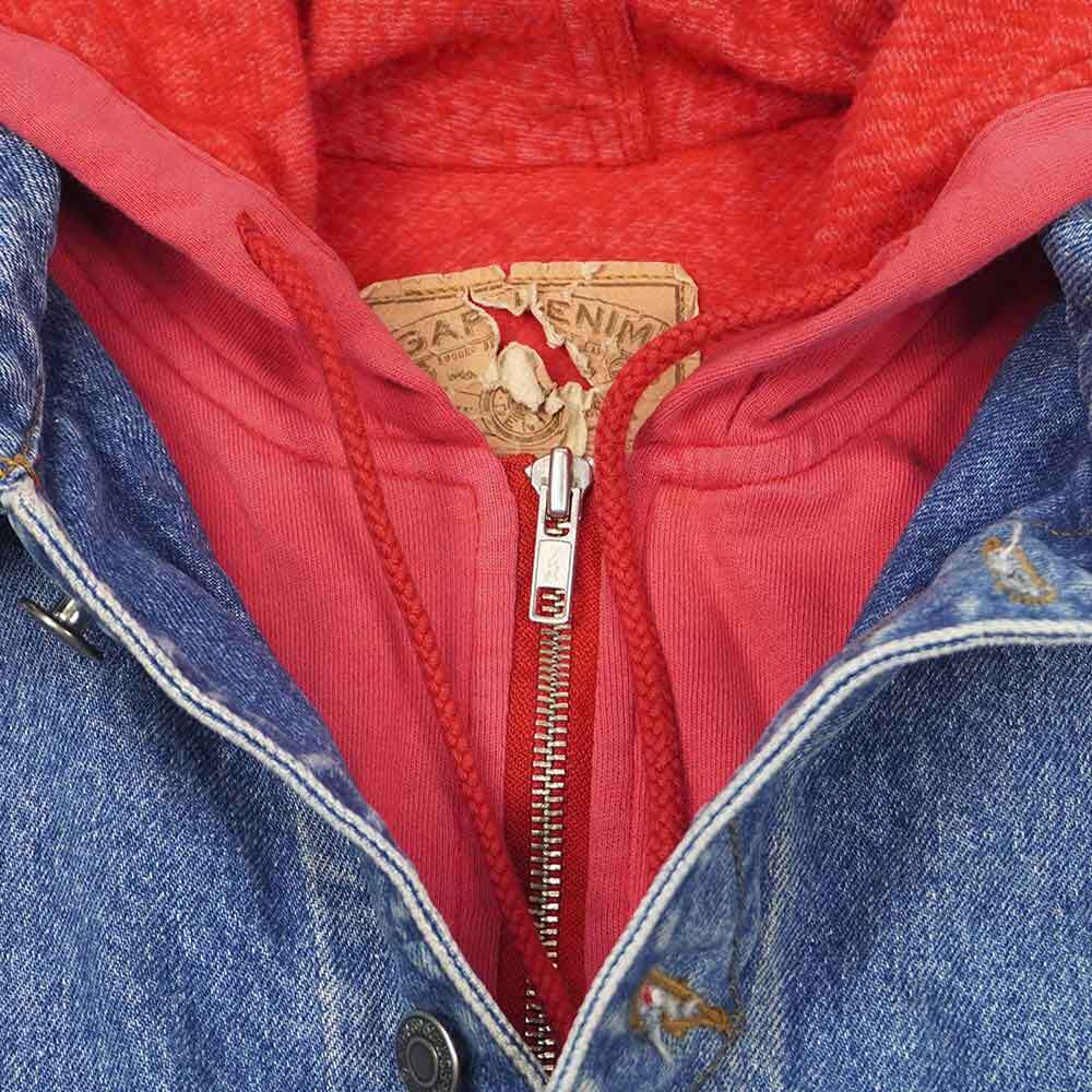 デニムジャケットにフルジップパーカーを重ね着したように見える、所謂フェイクレイヤード仕様のジージャンです。フード部分のみの装飾ではなく全体にライニングとして縫い付けられた仕様で、本体のポケットの形状等にもオールドギャップらしい遊び心が感じられるデザインです。