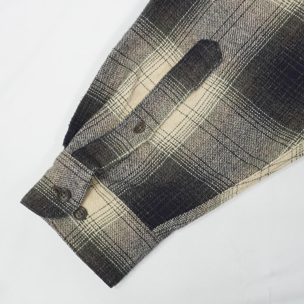 形の良いレギュラーカラーやフラップ付きのポケットなどが目を引くオーセンティックなワークシャツ型ですが、素材は風合いの良いウール混。さらに特筆すべきはその色柄で、黒に近い濃紺ベースのオンブレチェック柄はス雰囲気抜群です。