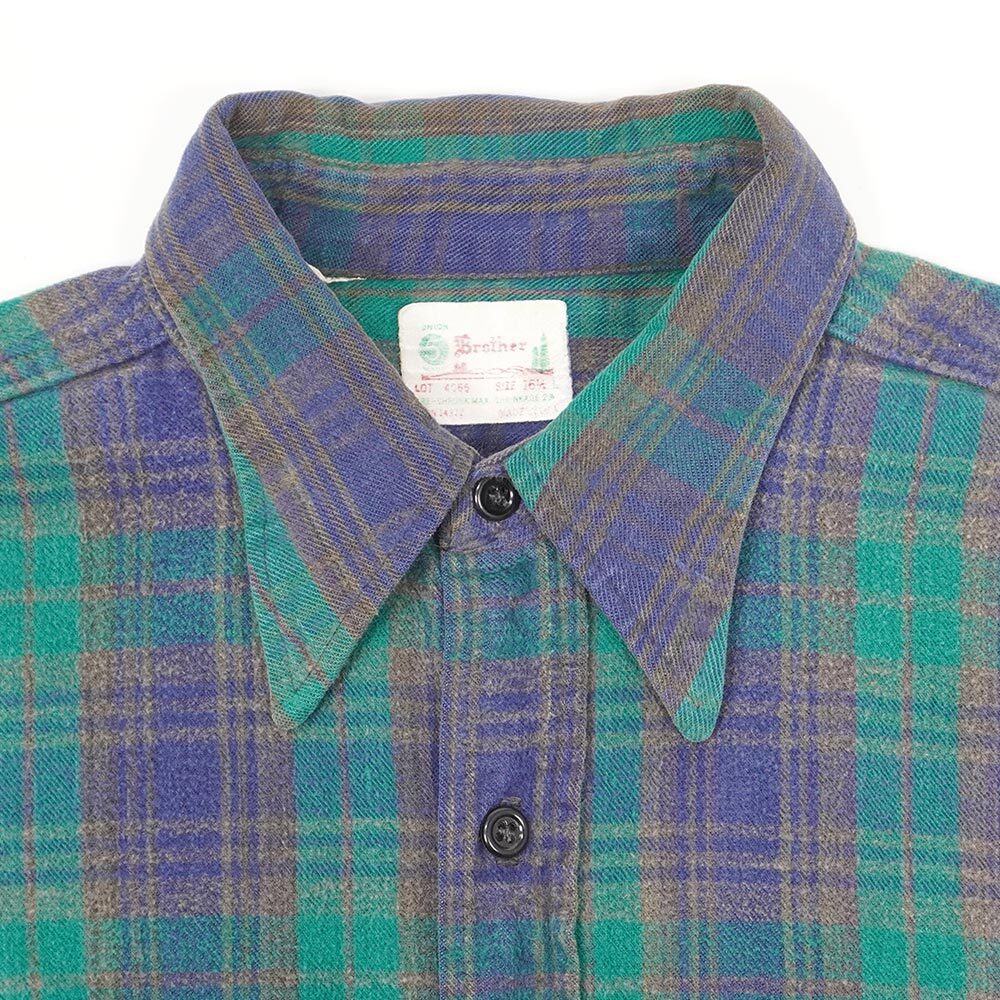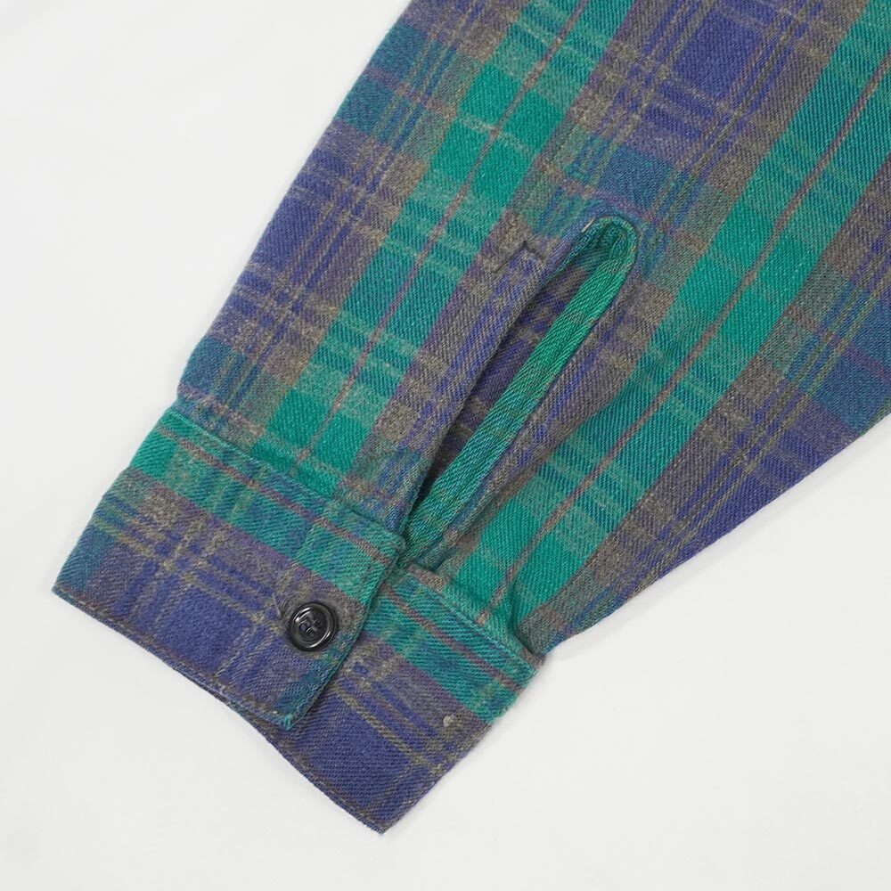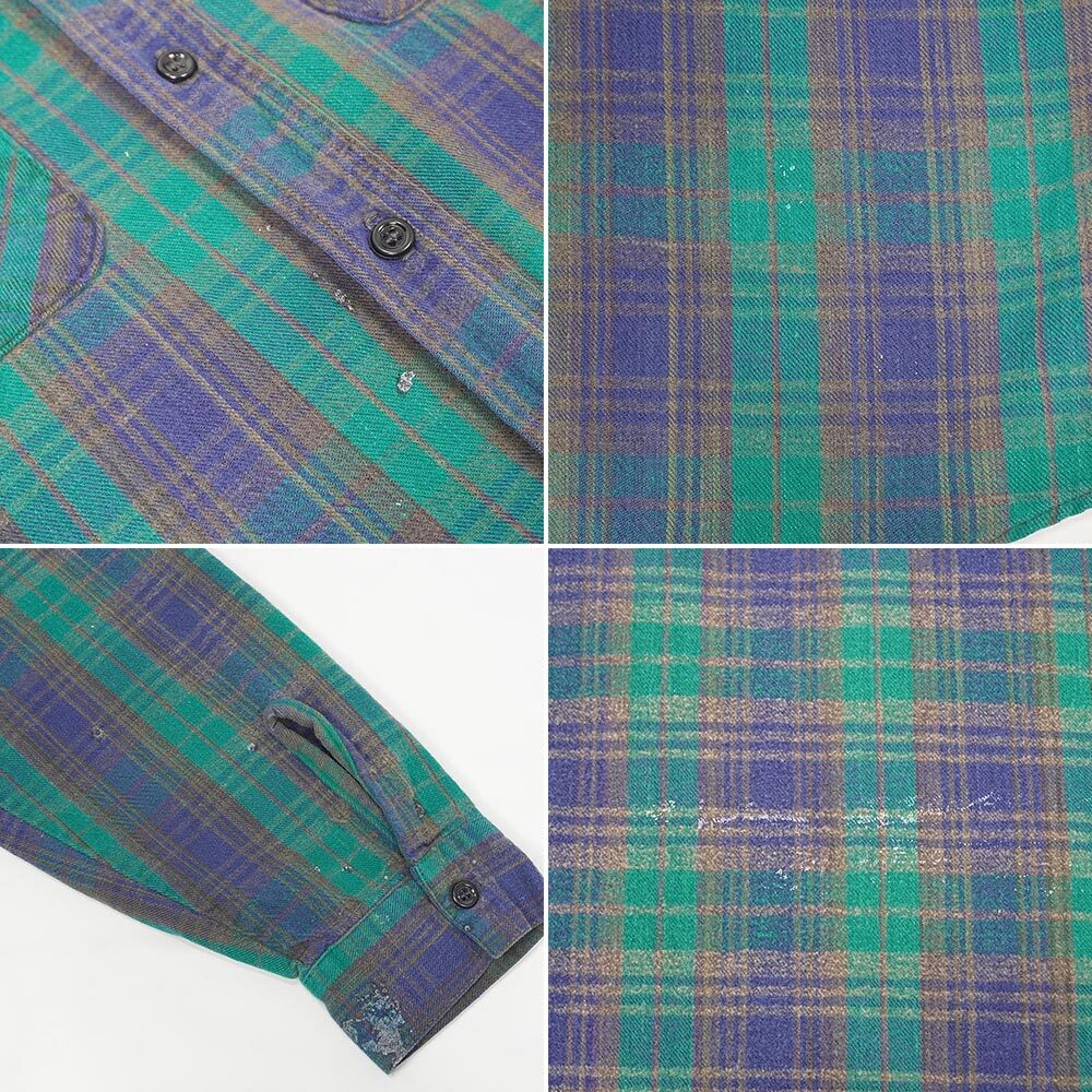 配色の良いグリーンベースのチェック柄が目を引く、70年代初頭頃にアメリカで製造されたファイブラのネルシャツです。着丈が短めの扱い易いサイズバランスで、汚れは否めませんが古いワークシャツらしい雰囲気を醸成する上では味と言える範囲のものと評価しております。