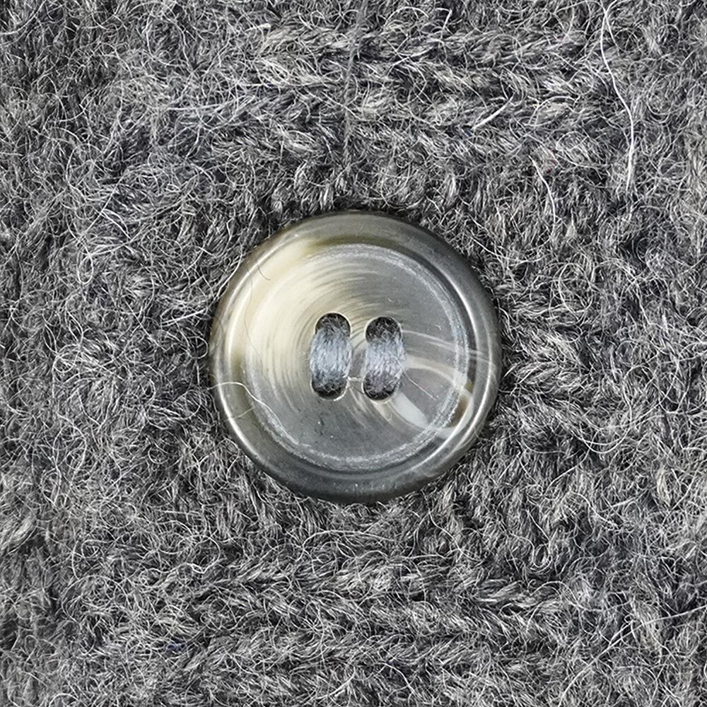 オーセンティックな畔編みで仕上げられた、上質なウールニットが魅力の一着。一般的なカーディガンと比べトップボタンが高めに付けられているためVゾーンが狭く、すっきりとした印象にまとめられたグッドレギュラーです。