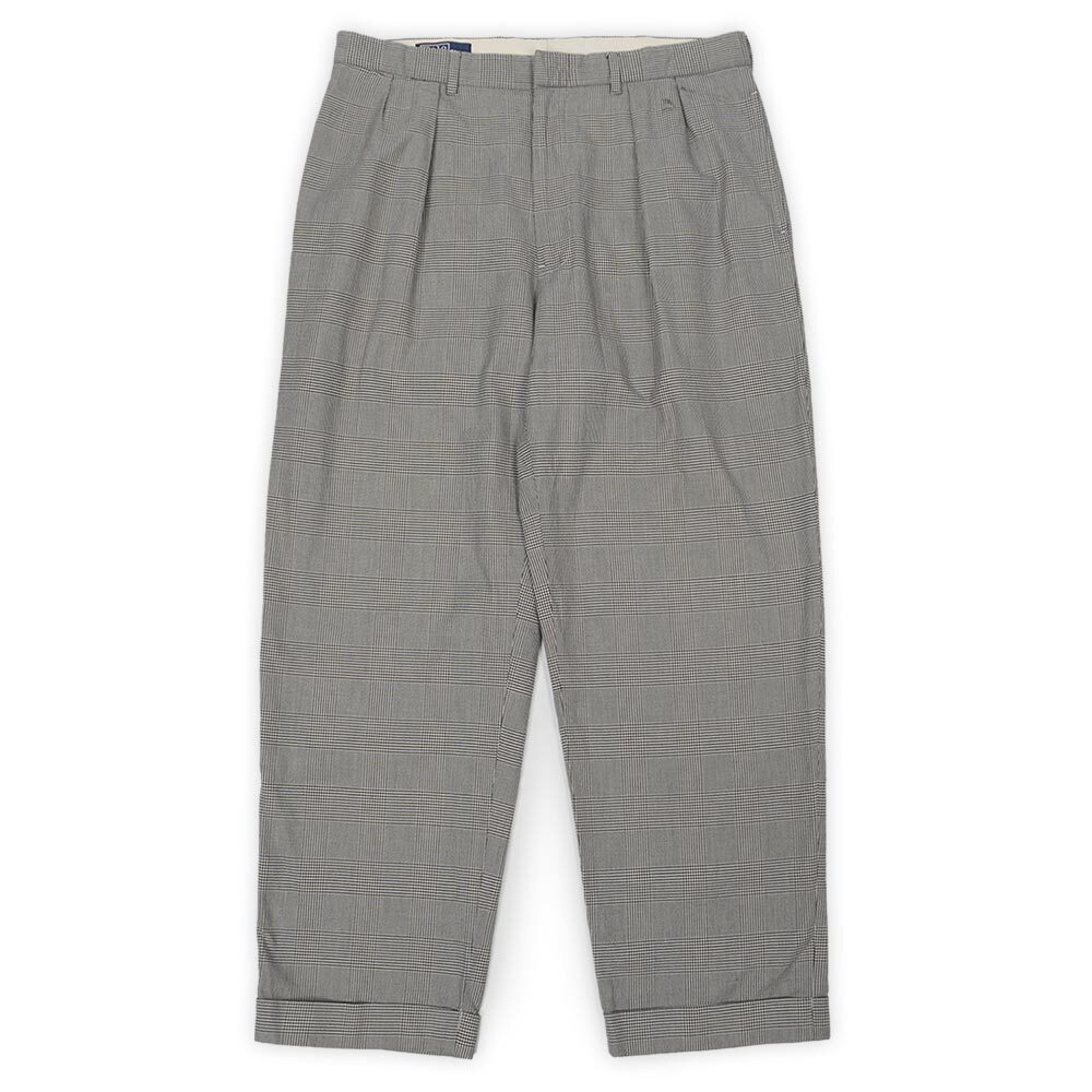 ラルフが得意とする2タックパンツですが、こちらはモノトーンのグレンチェック柄のファブリックで仕立てられたトラッドな印象の一本。薄汚れは否めませんが使用感は比較的少なめで、レングス30インチ表記の抜群のサイズ感も魅力です。