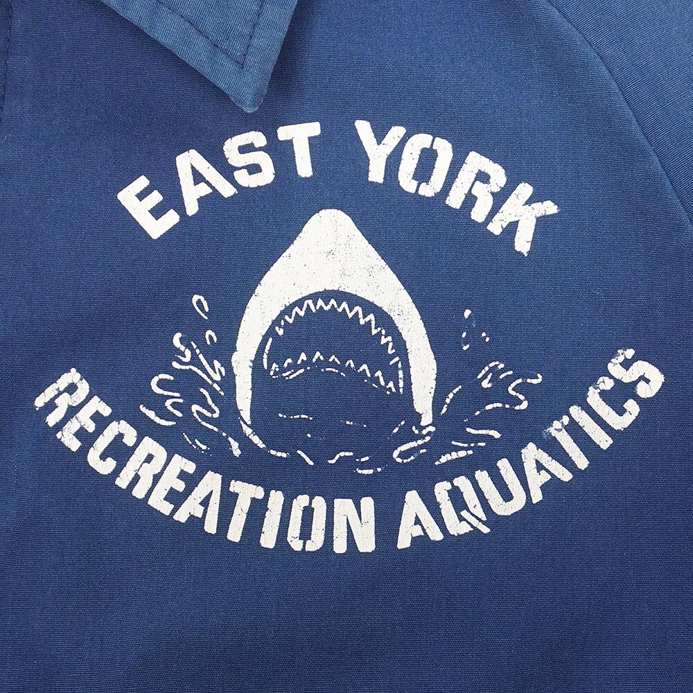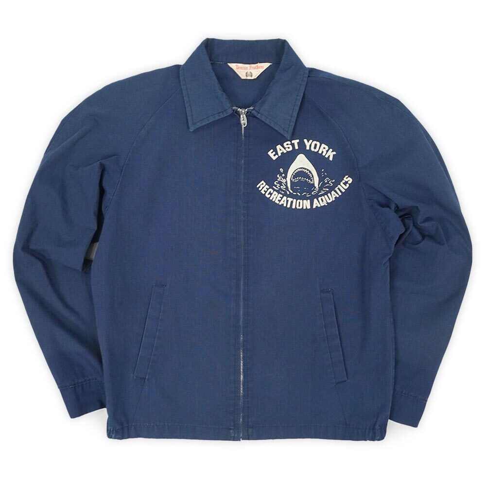 雰囲気良くエイジングしたネイビーボディに映える、鮫のグラフィックを組み込んだロゴプリントが目を引く一着。カナダ製のアウター類によく見られる丸みのあるジップヘッドが特徴のTALONジップも高査定ポイントです。