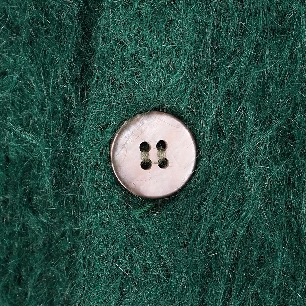 一目でそれと分かる毛足の長さと、玉数の少ない青みの強いグリーンの色味が魅力の一着。あると嬉しいポケット付きで、古いニット類にありがちな虫食いや縮み・型崩れがほとんど見られない極上品です。