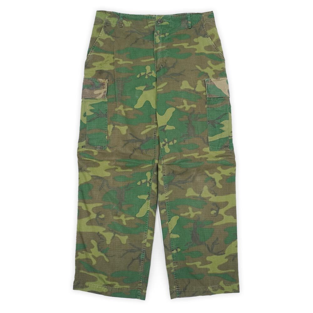 枯渇が進むベトナム戦争時に官給された人気種ですが、こちらはほぼ全面グリーンリーフカモの中、ポケットのフラップにのみブラウンリーフカモの生地が使われた『ミックスリーフ』仕様のレアピース。さらにお探しの方が多いMサイズのショート丈という抜群のサイズバランスも魅力です。
