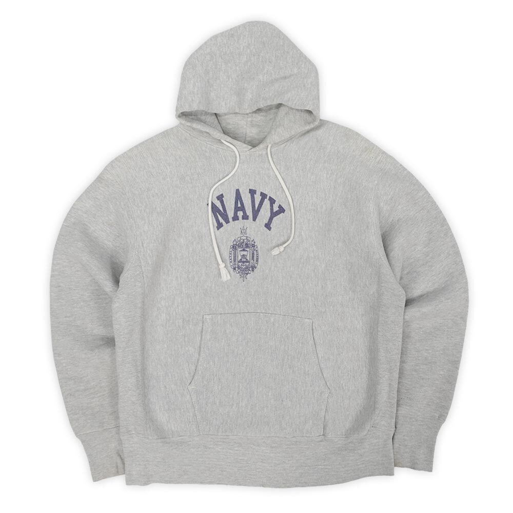 世界的に高騰が続くミリタリー系のリバースですが、こちらは稀少な単色タグ期の個体。大きなハトメや継ぎ目のない裾リブ、そしてこれ以降の物と比べて一回り小振りな染み込みプリントで施されたUS.NAVYのエンブレムが特徴です。