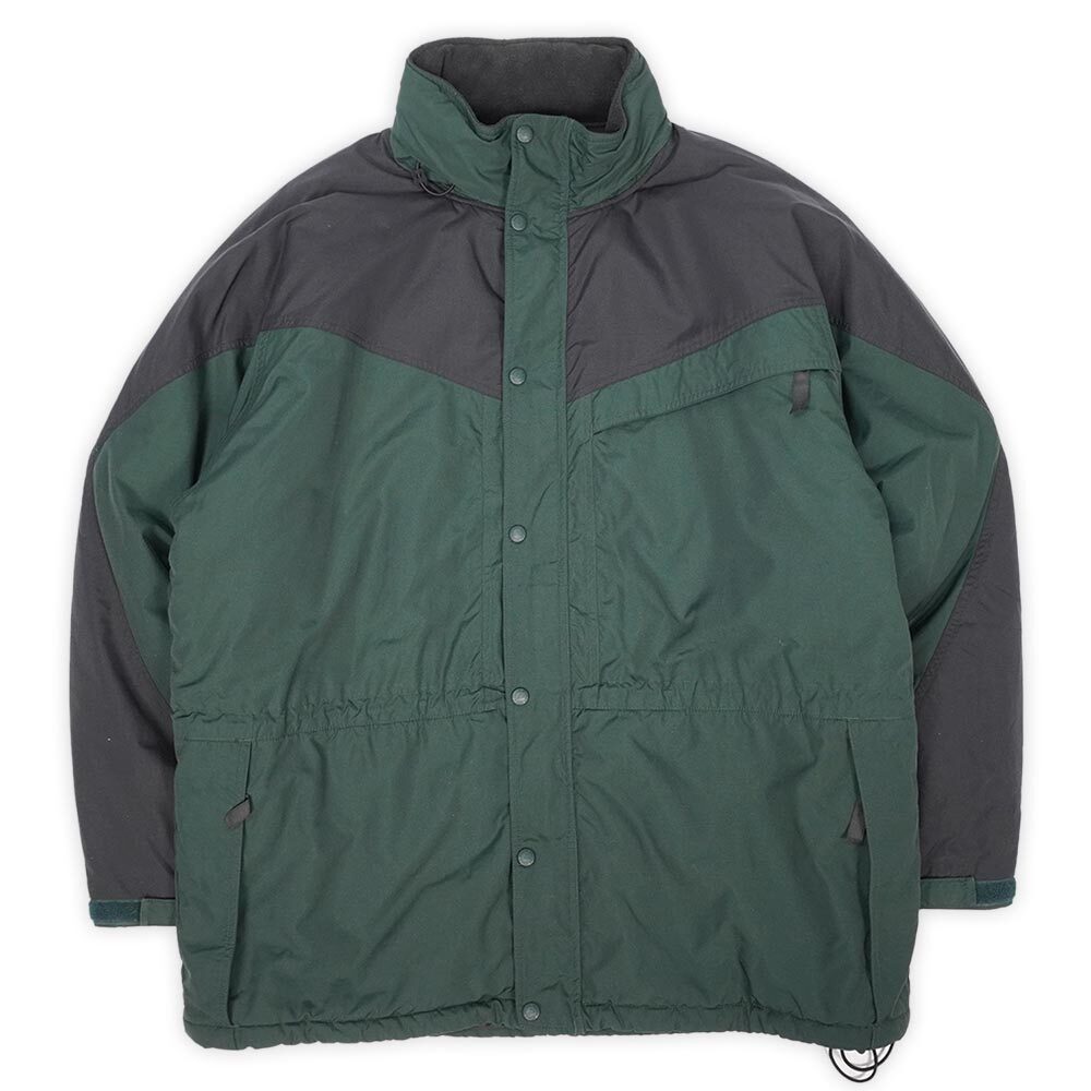 当時のアウトドアギアらしいバイカラー仕様が目を引くこちらは、複雑な切り替えとインサレーションに中綿を詰め込んだ防寒性の高い仕様が魅力の一着。フードはスタンドカラーに収納可能な2WAYタイプで、比較的状態が良い個体ですので長くお付き合いいただけるアイテムです。
