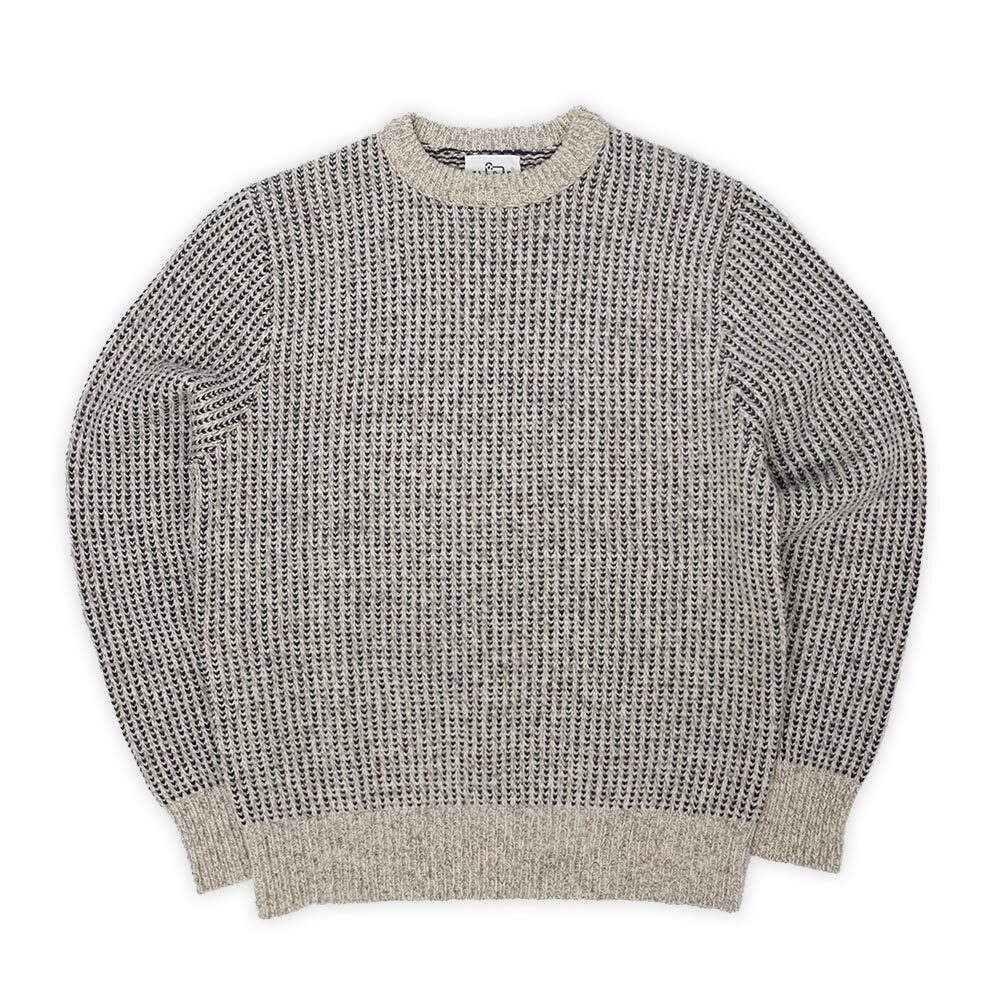 買い付けで見付かることが確実に減ってきた白タグ期のOLDウールリッチですが、こちらはシンプルな中に拘りが感じられるウールのセーター。オーセンティックな畔編みながら、配色と編み方の工夫で編み目がバーズアイのように見える面白いアイテムです。