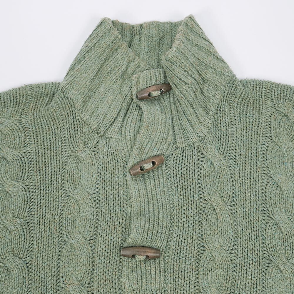 ダッフルコートで見られるトグルを使ったハーフボタン仕様が目を引く一着。素材はコットンかと思いきやシルク100%という変わり種で、オーセンティックなケーブル編みは雰囲気抜群です。