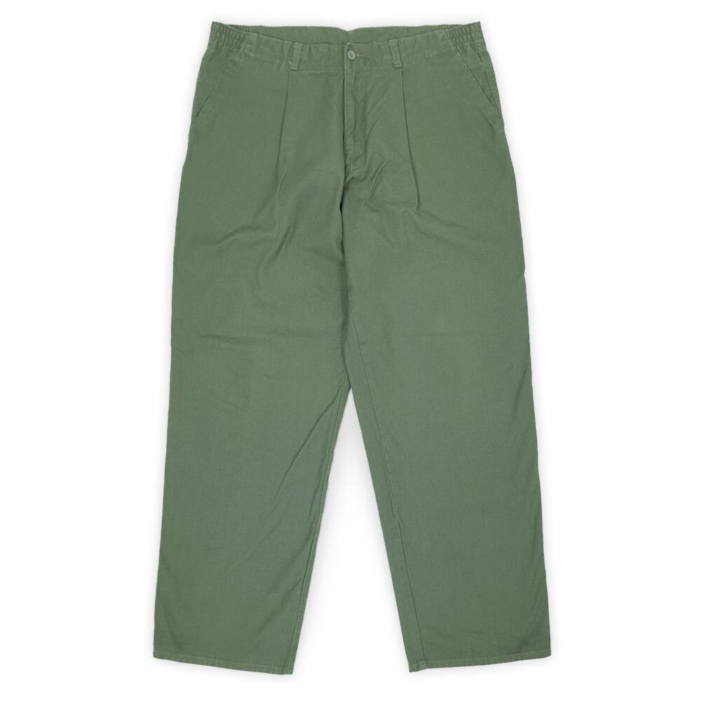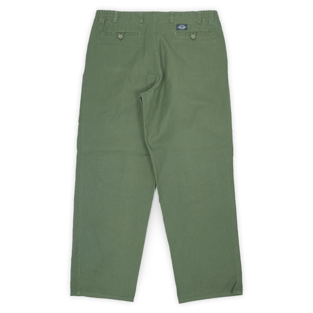 やや薄手ながら張りのあるキャンバス地で仕立てられた、ドッカーズのパンツ類の中でもあまり見掛けない仕様の変わり種。ブランド黎明期に近い1992年に製造された個体で、ハーフゴム仕様のウエストと2タックではなく1タックの腰回り、ミリタリーライクな色味、レングス30インチのグッドサイズと好条件が揃うおすすめの一本です。