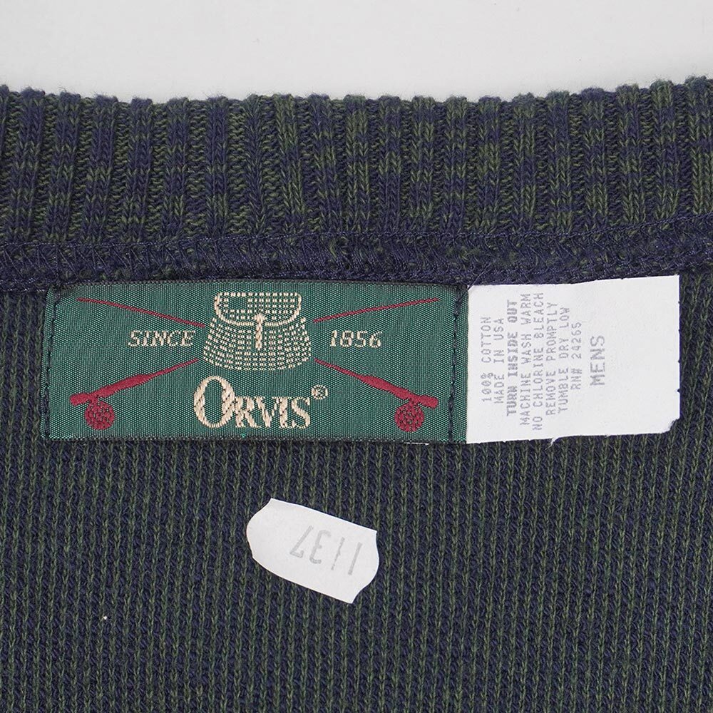 古着で鹿の子編みのスウェットと言えばLANDS' ENDが有名ですが、こちらはアメリカの同じ工場で製造されたORVISの物。よく見るとグリーンの糸がミックスされた生地はランズの物には見られないもので、風合い・着心地ともに抜群です。