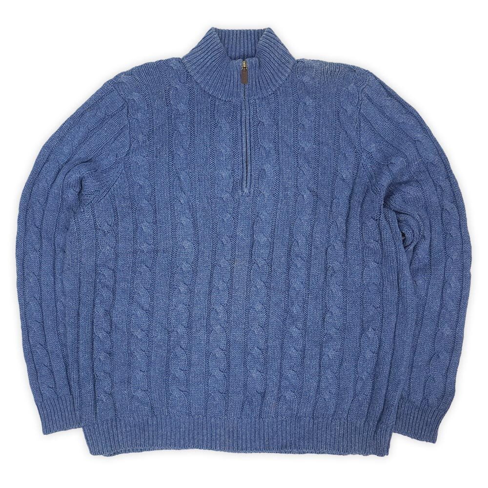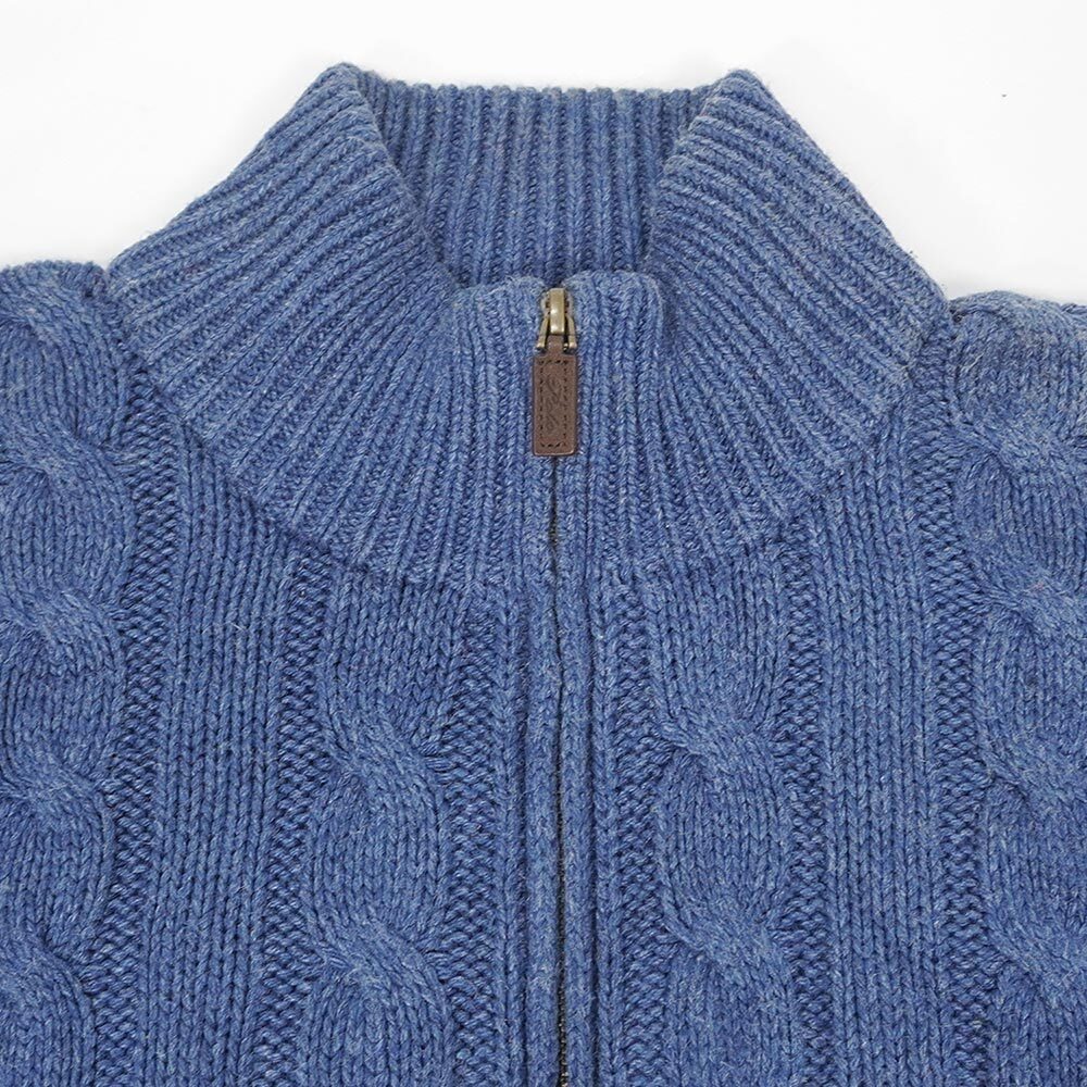 程良い高さのハイネックとそこに付くジップが特徴の、インディゴブルーのような色味も魅力の個体。素材はコットンかと思いきやシルク100%という変わり種で、オーセンティックなケーブル編みは雰囲気抜群です。