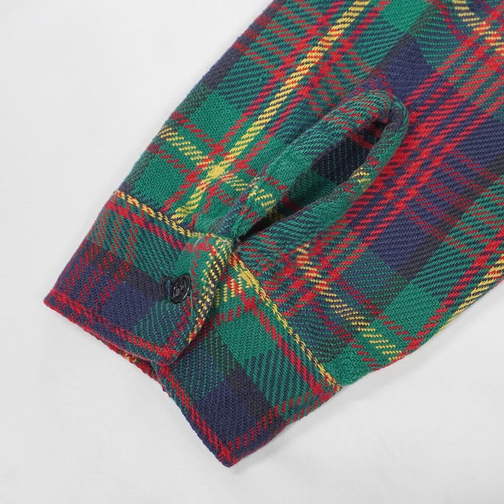 緑や紺を基調に構成された好配色のチェック柄が目を引く、70年代頃にアメリカで製造されたファイブラのOLD物。ダメージはございますが致命的なものではなく、元々の生産数が非常に少ない17ハーフ表記のビッグサイズも魅力です。