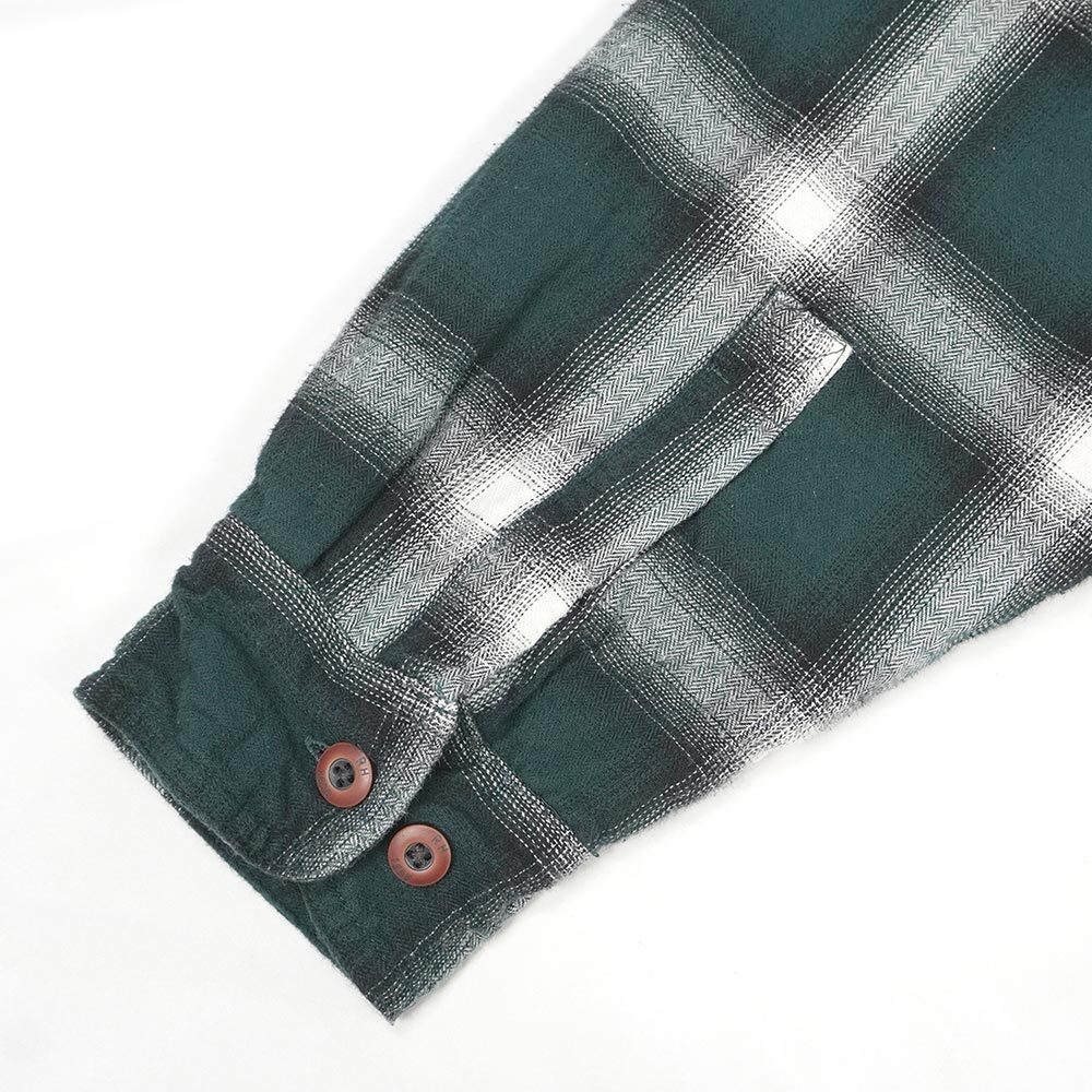 よく見ると絶妙なグラデーションでまとめられた、深い緑基調のシャドーチェック柄が目を引くグッドレギュラー。フリースのライナーが付く防寒性の高い仕様ですので、アウターとしてもお使いいただけるおすすめの一着です。