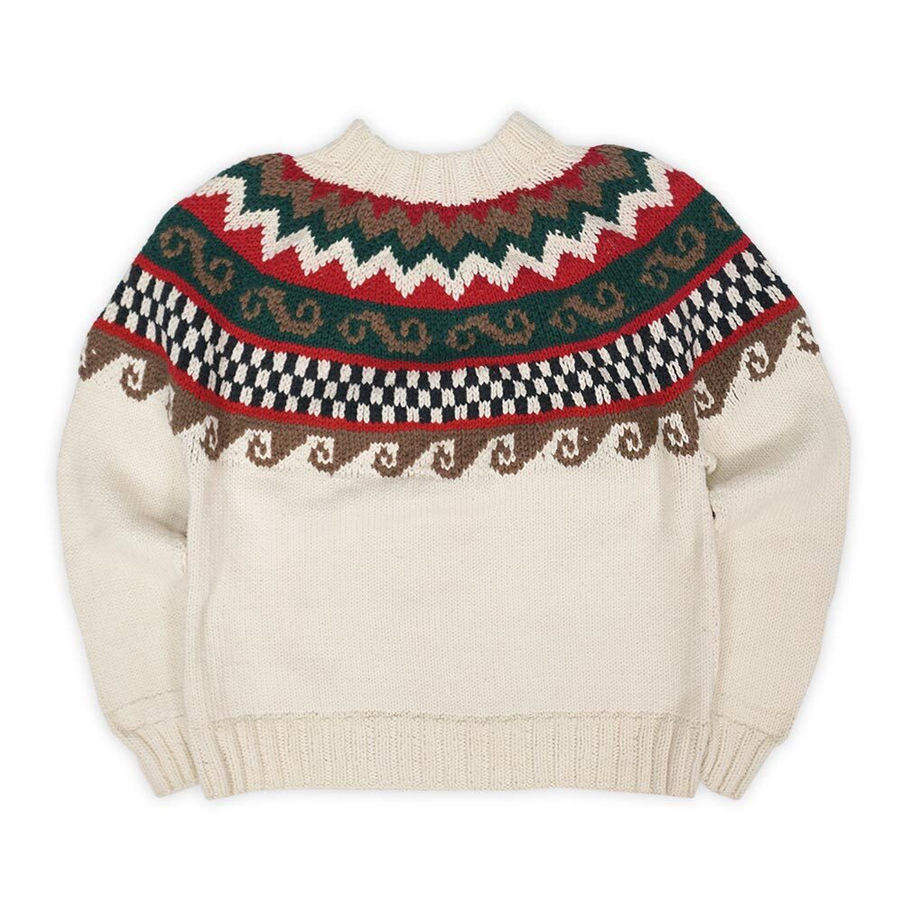 ベースの白に映える多色使いのノルディック柄が目を引く、ハンドニットらしい温かみが魅力の一着。ご家庭で容易にメンテナンス可能なコットン素材という点も嬉しいグッドレギュラーです。