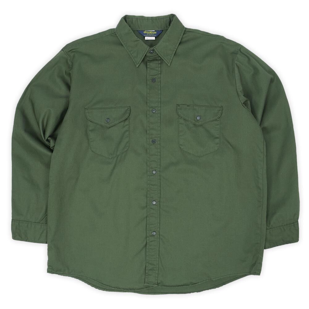 ツイル素材で仕立てられた無地のワークシャツは様々なブランドから輩出されていますが、こちらはオシュコシュのもの。トップ以外全てにスナップボタンが使われているのが特徴で、もちろんアメリカ製でXL-XXL相当のビッグサイズながら着丈が短めのシルエットも高査定ポイントです。