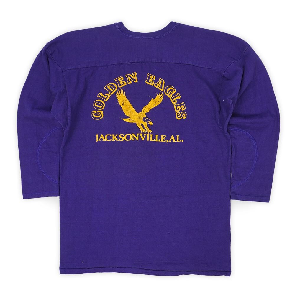肉厚なコットンで仕立てられた、非常に質の良いフットボールTeeを買い付けました。プリントのクラック、縮みがほとんど見られない比較的状態の良い個体で、エルボー部分の補強も古い年代の物ならでは。