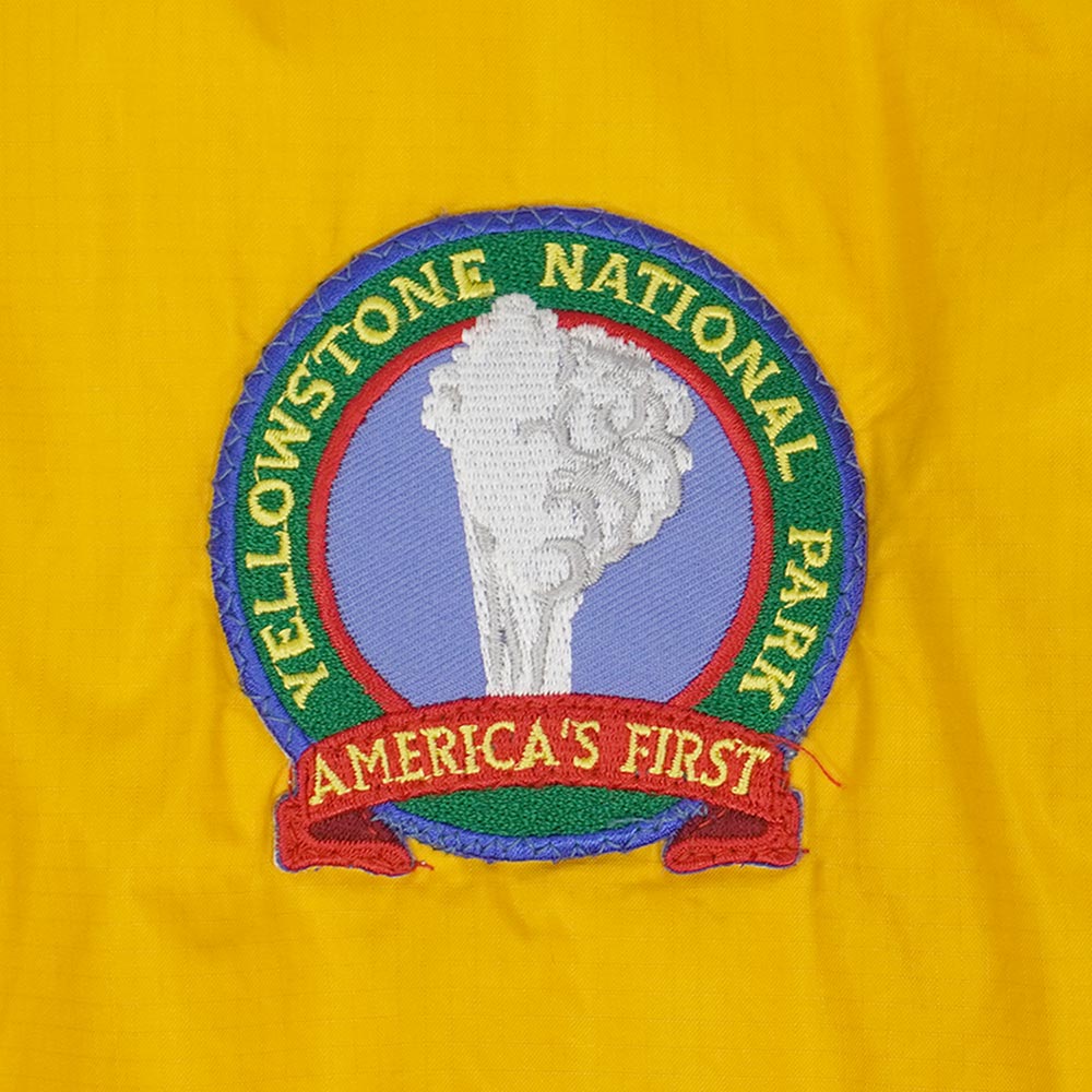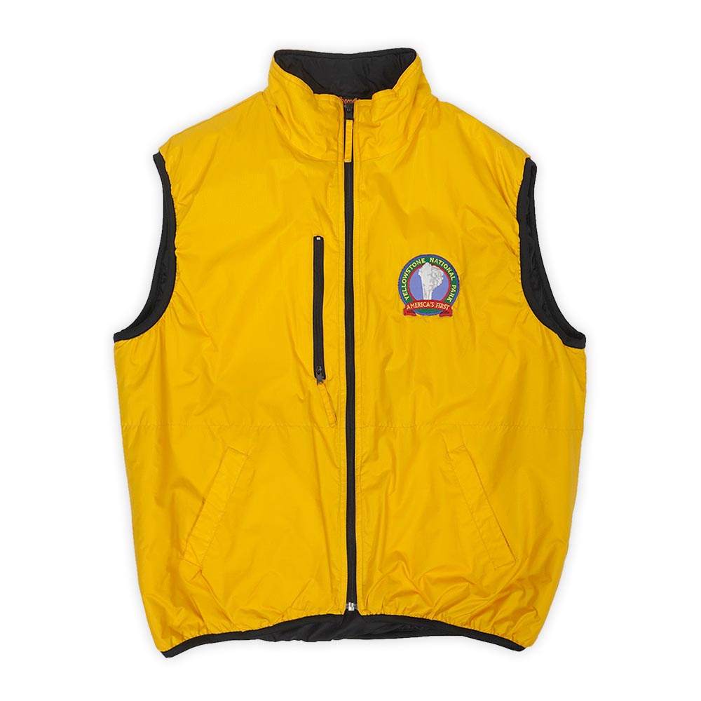 パタゴニアの名作『パフボールベスト』を彷彿とさせるデザインが目を引くパディングベスト。マイナーブランドですが抜群の配色と、左胸に縫い付けられた『YELLOWSTONE NATIONAL PARK』のワッペンが映えるグッドレギュラーです。