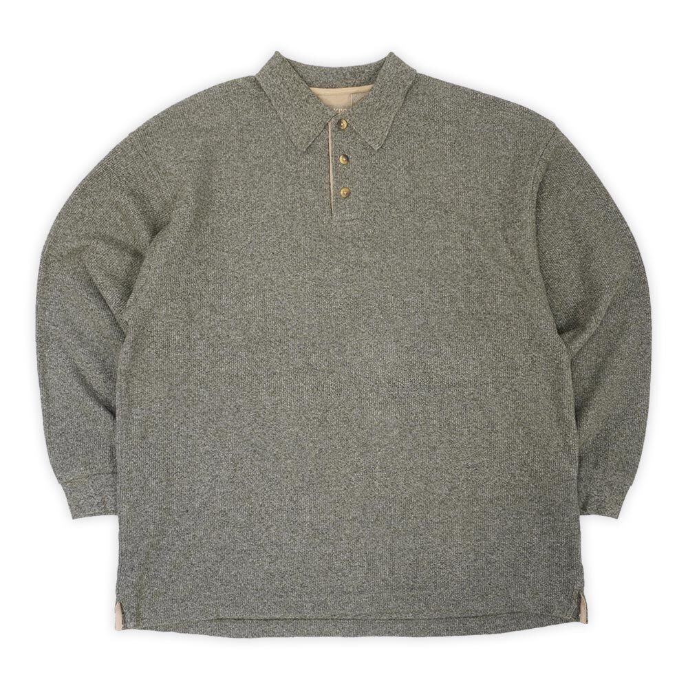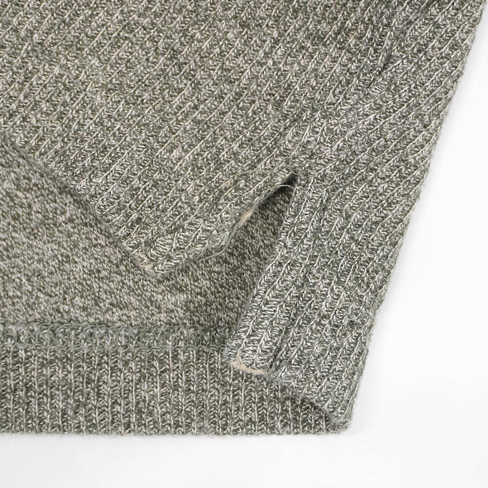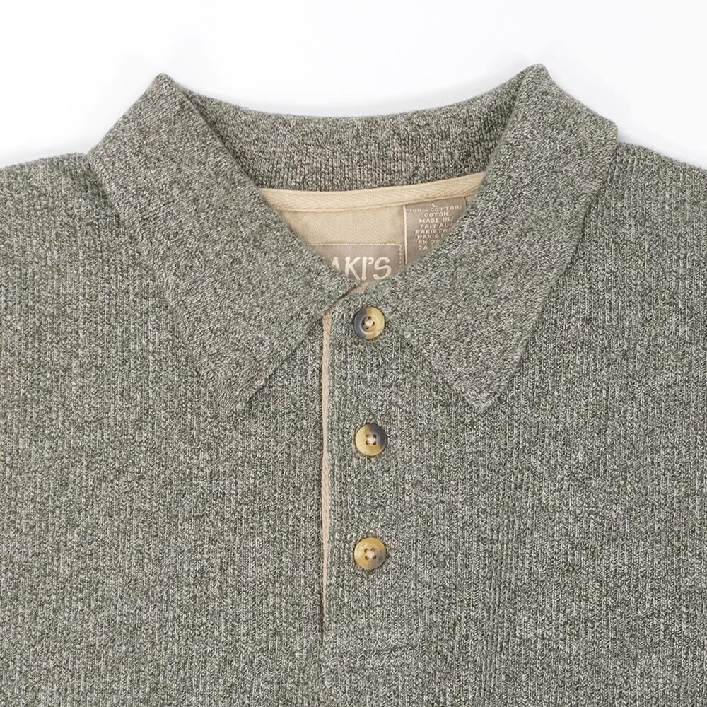 いなたいシャツ類で当店ではお馴染みのアローのカーキスラインですが、こちらはコットンニット素材のポロシャツ。オリーブとグレーをMIXした杢感豊かな色味で、ニットポロでは意外と見ない裾リブが付かない仕様も魅力です。