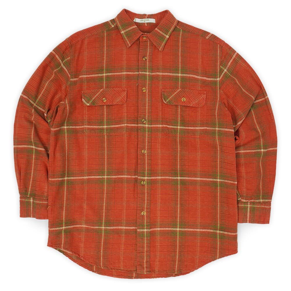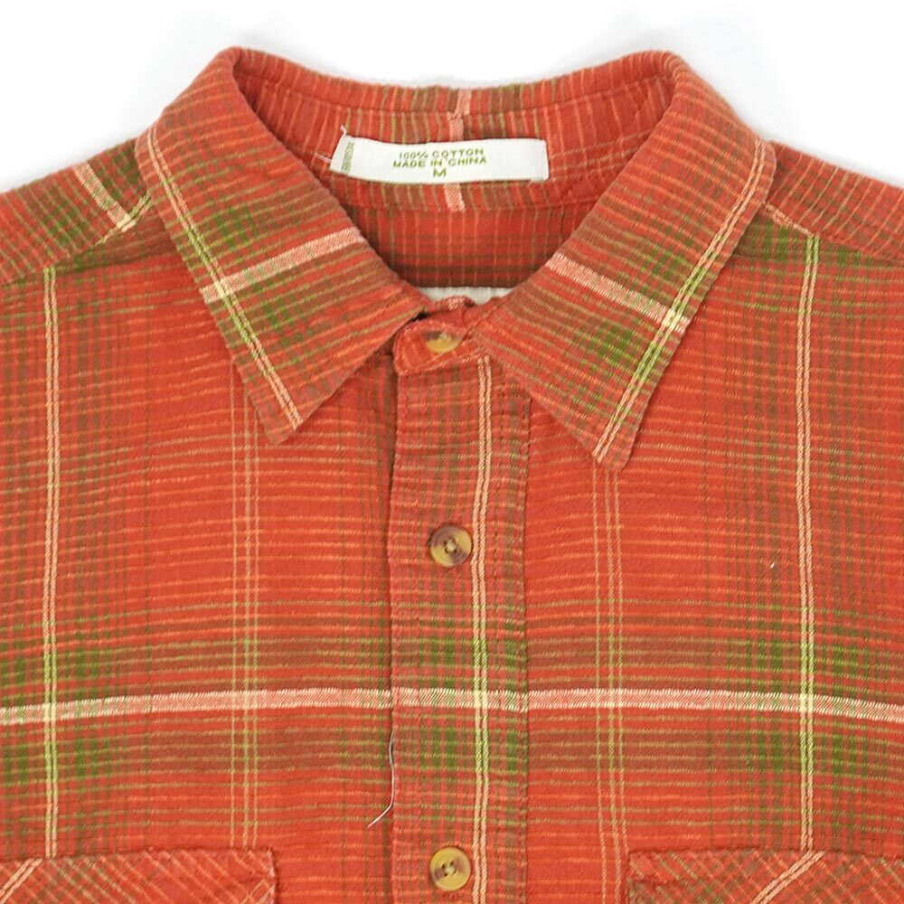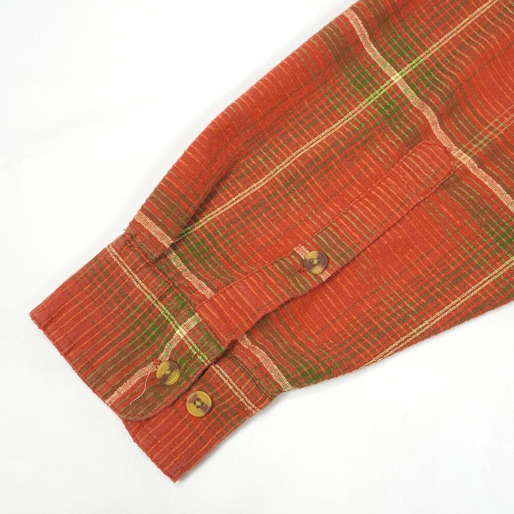 凹凸を付けて織られた、朱赤よりのオレンジ主体のボケあしの効いたチェック柄のコットン地で仕立てられた変わり種。オーソドックスなワークシャツ型ですので扱い易く、春先の羽織りとしても重宝するアイテムです。