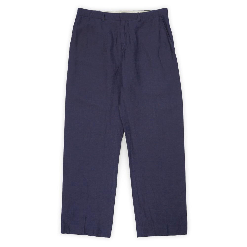 CALDWELLなどの開襟シャツでたまに見かける、リネンとシルクをブレンドした清涼感のある上質な素材感が魅力の一本。タックの入らないソリッドな仕様で、程良い太さの癖のないストレートシルエットは汎用性抜群です。