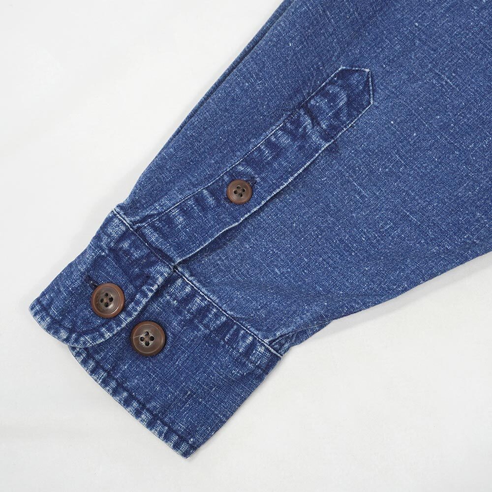 インディゴ染め特有の深い藍色が目を引く、風合い抜群のリネンコットンファブリックで仕立てられた稀少種。癖のないオーセンティックなワークシャツ型で、合わせるボトムス次第で綺麗目にもお召しいただけるおすすめのアイテムです。