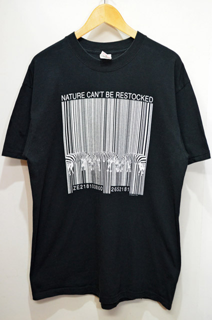 1990年代製、Human-i-TeesTシャツです。ボディはコットン100%製のanvil、黒地に白でシマウマとバーコードの騙し絵プリントが入ります。環境問題等の啓発目的で様々なデザインの物を発表しているブランドですが、代表作と言っても言い過ぎではないモデルです。お探しの方は是非この機会にご検討ください。